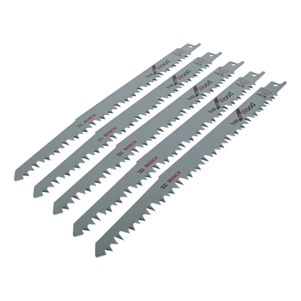 The Bosch S1531L 240mm Green Wood Reciprocating Saw Blades are long, coarse-toothed pruning blades supplied in a pack of five. Made from high carbon steel (HCS), they are purpose-built for fast cutting in green wood and fresh timber with low risk of snagging. Each blade measures 240mm (9.45 inches) for extended reach, with a cutting capacity up to 190mm (7.48 inches), making them suitable for thicker branches. The S1531L pattern fits reciprocating and sabre saws that accept the standard 1/2 inch (12.7 mm) universal/S-shank. A durable construction and open, aggressive tooth design help deliver quick, clean cuts that minimise damage to living plants. This is a Genuine Bosch part, OEM No. 2608650676, designed for reliable pruning performance in garden and landscaping work.