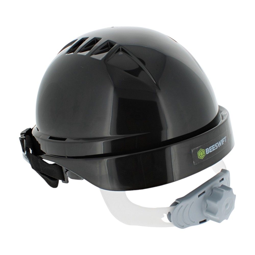 The Beeswift Hard Hat Safety Helmet with V Type 4‐point chin strap is a durable, vented safety helmet designed for daily use in demanding work environments. Its robust ABS shell helps protect against impacts while the ventilation slots promote airflow for comfort during long shifts. A 6‐point webbing harness spreads load evenly, and the built‐in sweatband helps manage perspiration. The ratchet adjustment at the rear makes size changes quick and secure, even with gloves on. A 30 mm slot fixing point allows fitting of common accessories such as ear defenders and face protection, keeping your PPE setup compact and practical. Finished in black for a clean, professional look, it is suitable for construction, manufacturing, utilities, maintenance, landscaping, and workshop use around plant, power tools, and site machinery.