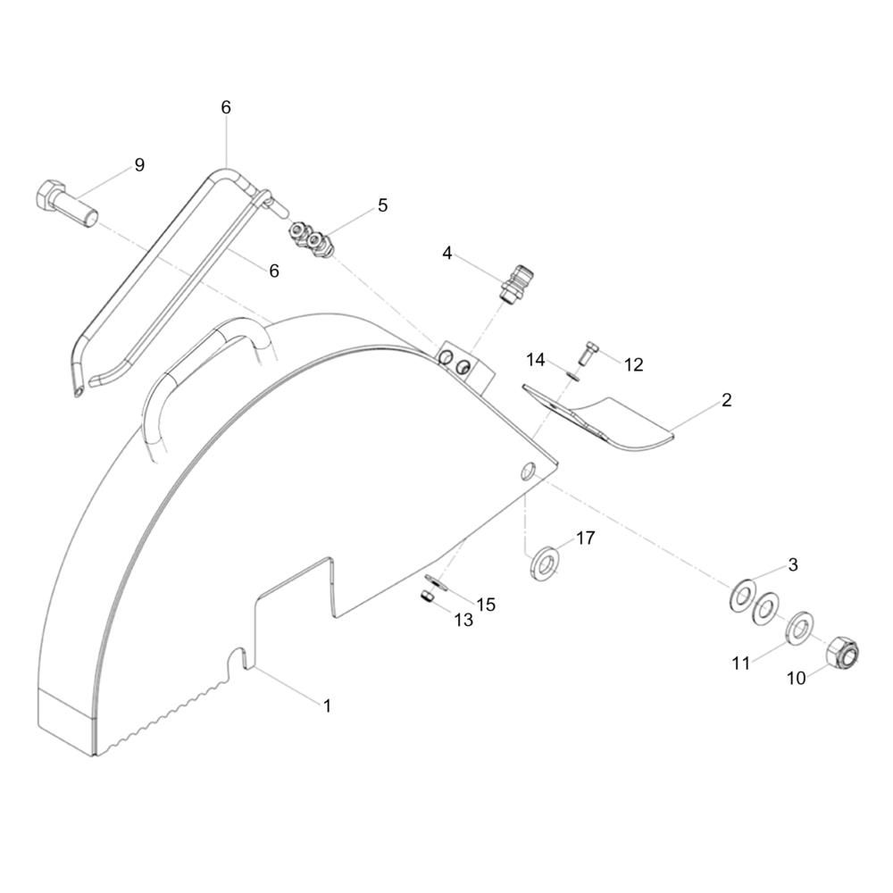 The Saw Guard Assembly for the Wacker BFS 1345 Floor Saw is designed to enhance safety and performance. It includes essential components such as protective covers and mounting brackets, ensuring the saw operates smoothly while safeguarding the user. This assembly is crucial for maintaining the integrity of the floor saw during cutting operations.