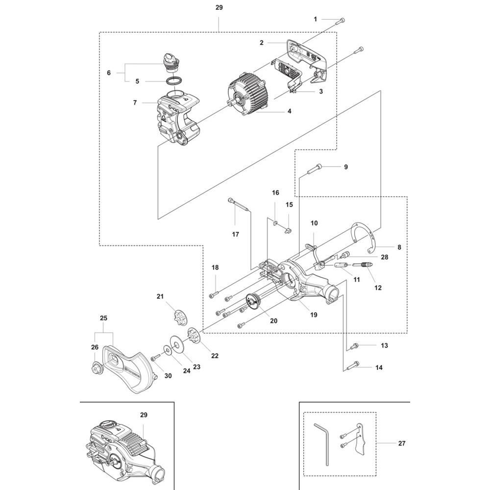 The Saw Head Assembly for Husqvarna 530iPX Pole Pruners is designed to ensure efficient cutting performance and durability. This assembly includes key components such as the chain, bar, and sprocket, which work together to deliver precise cuts. Ideal for maintaining trees and shrubs, it supports the pruner's overall functionality and longevity.
