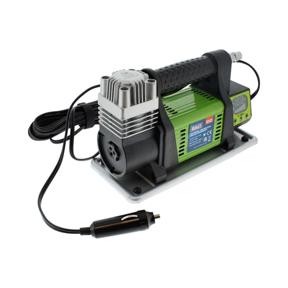 The SEALEY 12V Digital Tyre Inflator/Mini Air Compressor is a compact, high-efficiency tool designed to simplify the process of tyre inflation. With its capacity to deliver 25L/min, it can inflate tyres from 0-30psi in approximately 139 seconds for tyres size 175/70/R13. This user-friendly device allows you to set your desired pressure, and it automatically inflates the tyre to this level, eliminating the need for manual checking with a gauge. It comes with a quick-release coupling on the air output hose for added convenience, making it an indispensable tool for cars, bicycles, and sports equipment.