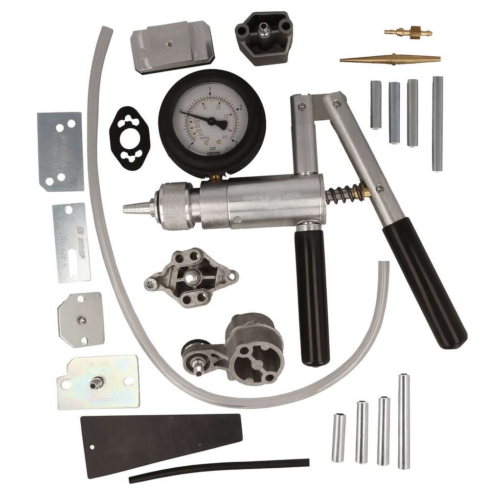 Two‐stroke pressure and vacuum test kit, engine leak‐down tester for small engines, crankcase pressure tester, carburettor pressure/vacuum diagnostic set, impulse system tester, workshop engine test kit, small engine diagnostic kit, pressure testing kit for chainsaws and garden machinery.