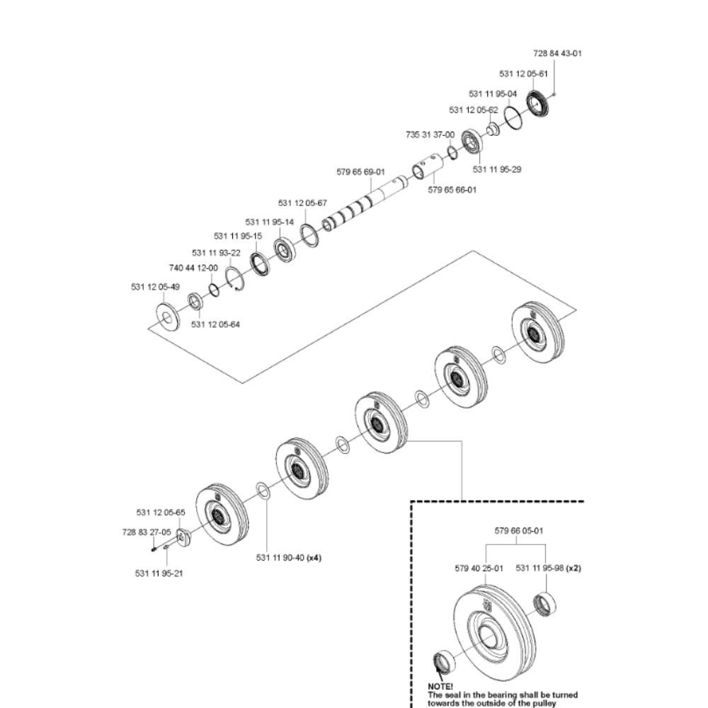 The Shaft Assembly for the Husqvarna CS 2512 Wire Saw is designed to ensure optimal performance and longevity of your equipment. This assembly includes key components that facilitate the smooth operation of the wire saw, such as shafts, bearings, and connectors. Genuine Husqvarna parts are used to maintain the integrity and reliability of the machine, ensuring efficient cutting and reduced downtime.