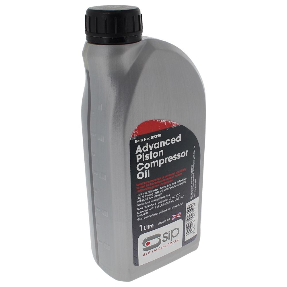 The SIP 1 Litre Advanced Compressor Oil (MPN 02350) is a genuine SIP Industrial Products lubricant for modern reciprocating piston air compressors. Formulated from quality base oils with anti-oxidant, anti-wear, anti-rust and anti-corrosion additives, it delivers stable lubrication for moving parts and protects internal surfaces against moisture and contaminants. A high viscosity index ensures dependable flow during cold starts while maintaining protective film strength at operating temperature. With oxidation resistance up to 220°C (428°F), it helps keep valves, rings and passages cleaner for reliable performance. Suitable for routine servicing and top-ups on workshop and site compressors that specify a DIN 51506 VC-L grade oil, this 1 litre bottle supports smooth running and long component life.