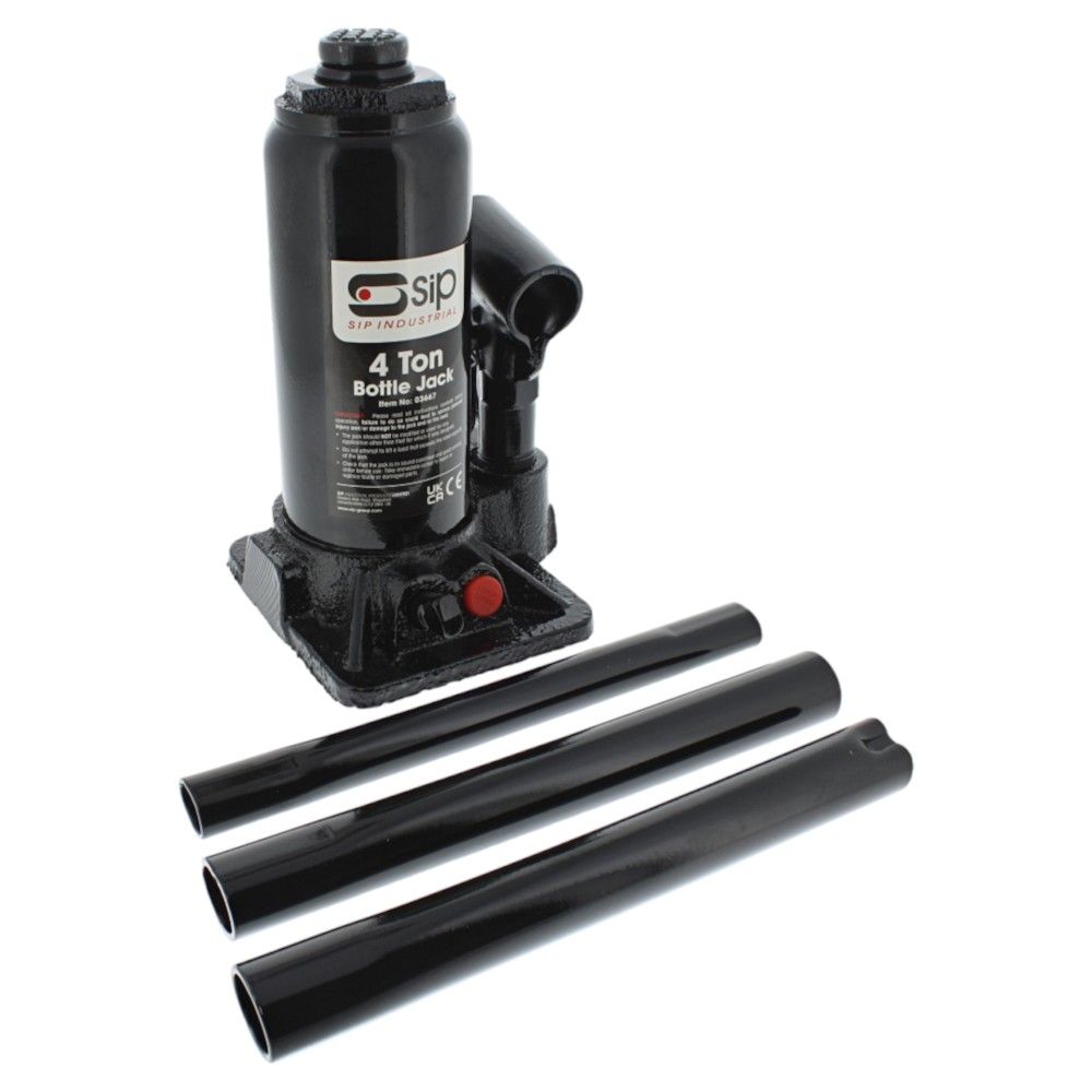 The SIP 4 Ton Bottle Jack is a compact, manual hydraulic lifting jack for vehicles and machinery where space and access are limited. Built around a durable design with a heavy-duty cast iron base for stability, it provides dependable lift performance up to 4 ton (approx. 3,629 kg). A screw extension allows you to fine‐tune the starting height, while a serrated saddle helps grip the load. An integrated safety valve protects against overload. This Genuine SIP Industrial Products part is suitable for garages, workshops, mobile maintenance, and roadside recovery. With a minimum lifting height of 183.0 mm and a maximum lifting height of 354.0 mm, it covers common lifting tasks on cars, vans, trailers, and light plant or garden machinery during service and repair.