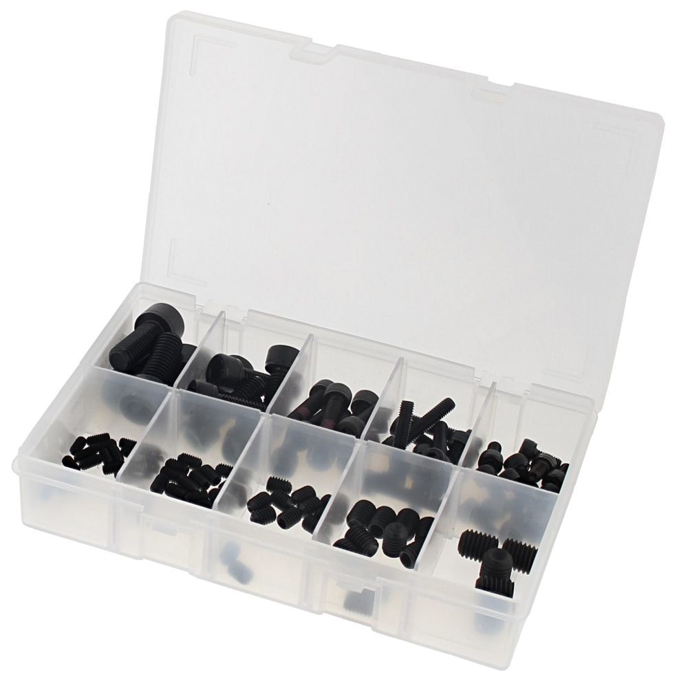 | Key Features | - 100-piece assortment of metric socket set and cap screws - Sizes range from M4 to M10 for common tasks - Hex socket drive compatible with standard Allen keys - Steel with black oxide finish for mild corrosion resistance - Organised box for easy storage and selection |
