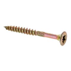 The Spectre Screw PZ Compatible CSK ZYP 5.0 x 70mm by ForgeFix is a versatile woodscrew for reliable fixing in timber and sheet materials. Made from steel with a zinc yellow passivated (ZYP) coating, it offers strong corrosion resistance for indoor and general outdoor use. A double countersunk countersunk (CSK) head sits flush for a neat finish and improved head strength, while the Pozi-compatible recess provides positive drive with common PZ bits. The sawtooth single thread and built-in reamer feature help the screw cut cleanly, pull timber together, and reduce splitting or jacking. Size: 5.0 x 70 mm (approx. 0.20 x 2.76 in) with a 42 mm thread length (approx. 1.65 in). Supplied in a box of 100, ready for site, workshop, and maintenance tasks using drill drivers, impact drivers, or hand screwdrivers.