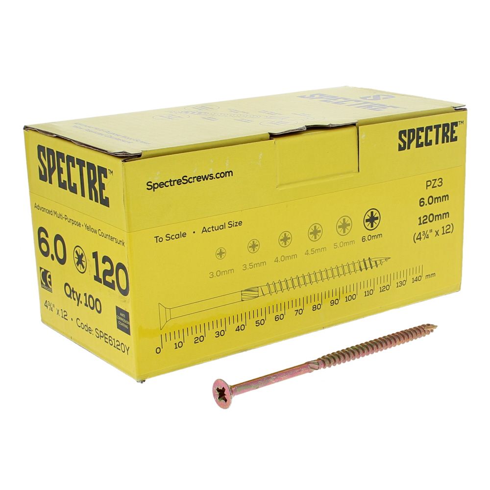 The Spectre Screw PZ Compatible CSK ZYP 6.0 x 120mm (Box of 100) by ForgeFix is a versatile wood screw for general construction, carpentry and joinery. Manufactured from steel with a zinc yellow passivated (ZYP) finish, it offers good corrosion resistance for indoor and sheltered use. The advanced sawtooth thread helps the screw cut cleanly into timber to reduce splitting and lower driving torque. A double countersunk (CSK) head sits flush for a tidy finish and helps reduce head shear on high‐load applications. The Pozi compatible recess provides positive bit engagement for hand screwdrivers and cordless drill/drivers. Size: 6.0 x 120mm with a 72mm threaded section, supplied in a pack of 100. Suitable for softwood, many hardwoods, MDF and chipboard where a reliable, long‐lasting hold is required.