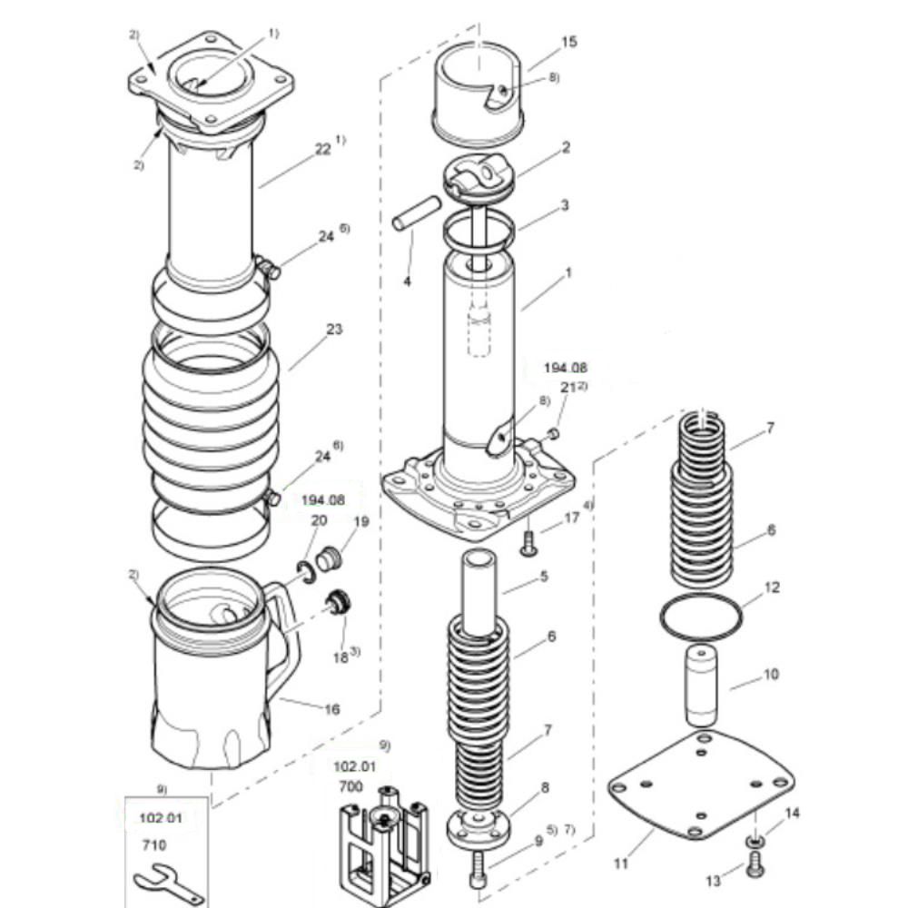 The Spring and Guide Unit Assembly for Bomag BT60 Rammers is essential for maintaining optimal performance and stability. This assembly includes genuine Bomag spare parts designed to absorb shock and guide the rammer during operation. It ensures efficient energy transfer and reduces wear on the machine, contributing to its longevity and reliability.