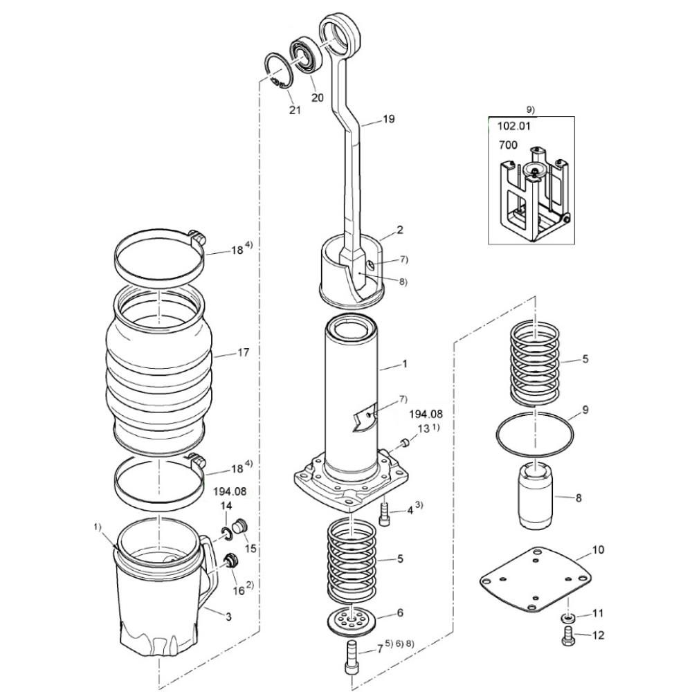 The Spring and Guide Unit Assembly for the Bomag BVT65 Rammer is a genuine Bomag part designed to ensure optimal performance. This assembly plays a crucial role in the machine's operation by providing stability and control during use. It includes components such as springs and guides, essential for maintaining the rammer's efficiency and longevity.