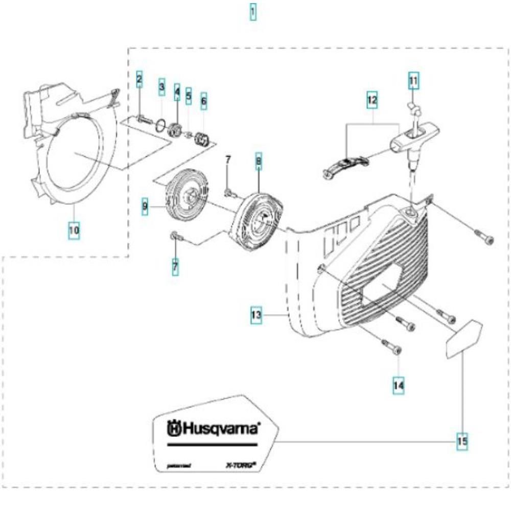 The Starter Assembly for the Husqvarna K970 Rescue III Disc Cutter is crucial for reliable engine ignition. Designed to ensure smooth starting, it includes components like the recoil spring, starter rope, and housing. This assembly helps maintain optimal performance and extends the lifespan of the disc cutter by providing consistent starting power.