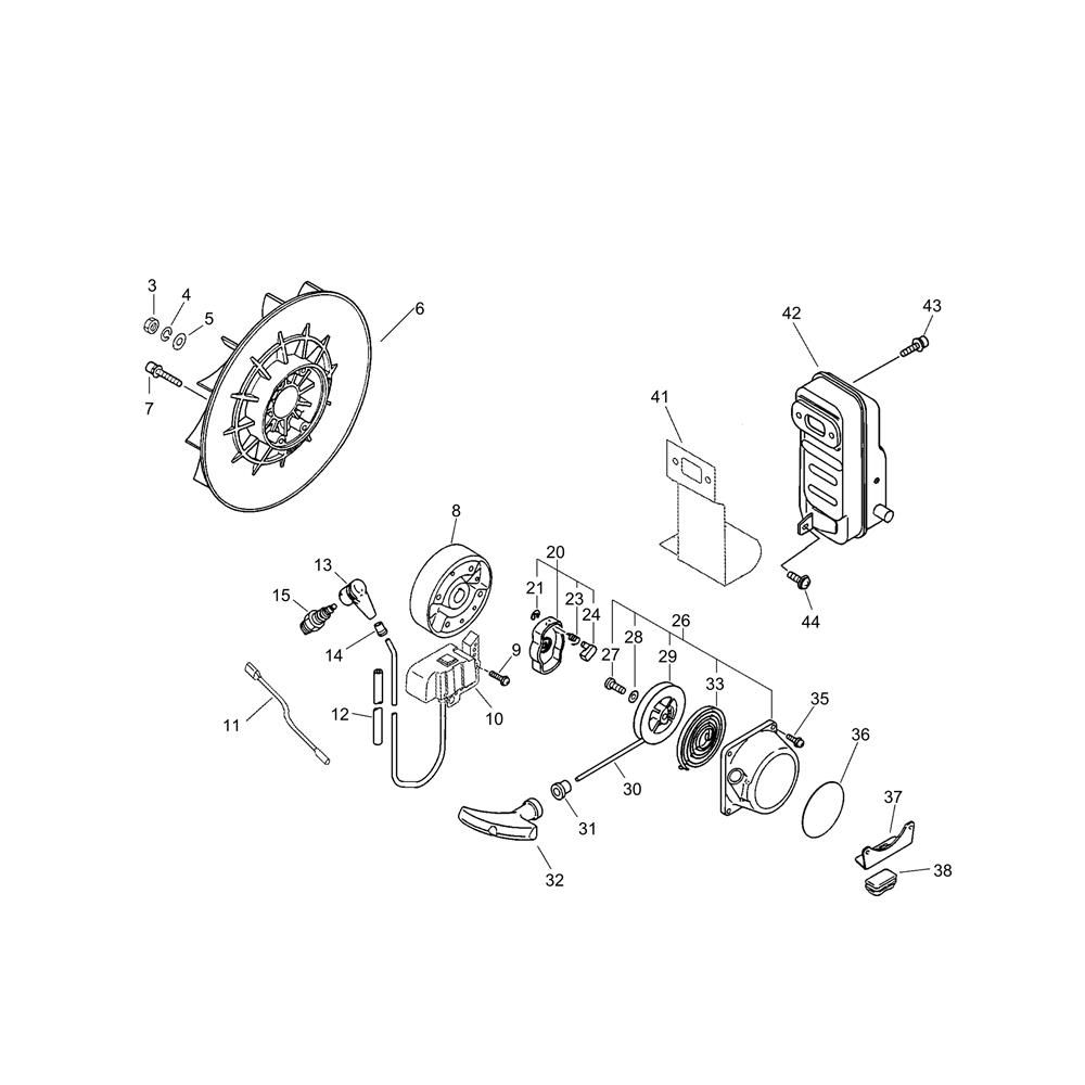 The Starter, Magneto, and Muffler assembly for the ECHO MB-440 Duster-Mistblower ensures optimal performance and longevity. The starter facilitates engine ignition, the magneto generates necessary electrical power, and the muffler reduces noise emissions. Available in genuine and non-genuine parts, these components are essential for maintaining efficient operation.