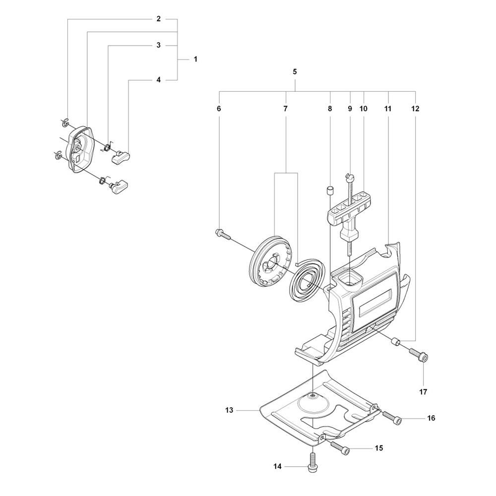 The Starter Assembly for the Husqvarna 327P5x Pole Pruner is designed to ensure efficient engine ignition and reliable performance. This assembly includes key components such as the recoil spring, pulley, and starter cord, which work together to facilitate smooth starting. Genuine Husqvarna parts ensure compatibility and durability, making it ideal for routine maintenance and repairs.