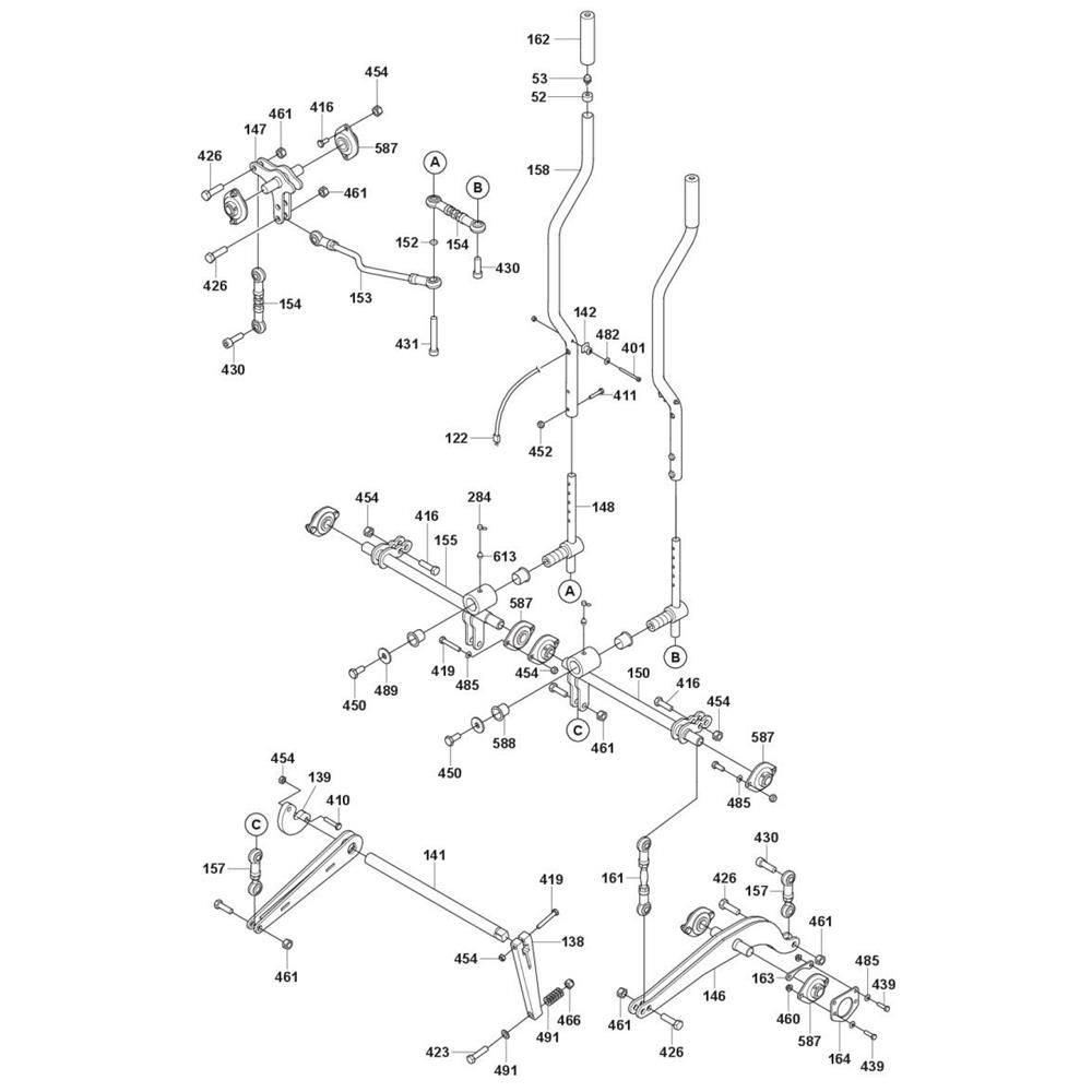 The Steering Assembly for the Husqvarna CRT 48 Diesel Trowel is essential for precise control and manoeuvrability. Designed for durability, it includes components such as levers, rods, and linkages, ensuring smooth operation. This assembly helps maintain optimal performance and safety during use, making it a crucial part of routine maintenance and repair.