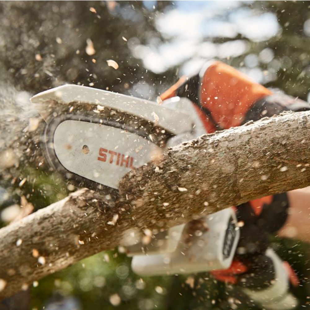 The Stihl GTA 26 Cordless Garden Pruner is a versatile tool designed for efficient pruning of trees and shrubs. This genuine Stihl product, identified by OEM No. GA01 011 6917, is crafted to handle a variety of garden tasks, including cutting up garden waste and assisting in wood construction projects. Equipped with a 1/4" PM3 saw chain, it delivers excellent cutting performance and powerful cuts. The pruner features comfortable, rubberised handles for precise control, making it an ideal choice for both professional tradespeople and DIY enthusiasts.