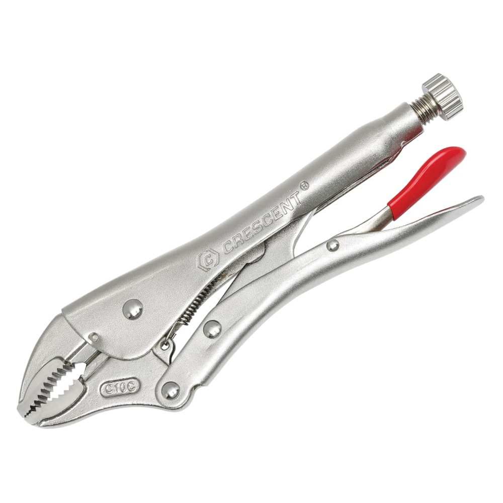 Crescent Straight Jaw Locking Pliers feature a nickel-plated finish for rust resistance and durability. The angled tooth design enhances grip, while an integral wire cutter adds functionality. The compound gripping action ensures a powerful, non-slip hold. A red plastic dipped release lever offers comfort, and the handle includes a hex key hole for added torque.