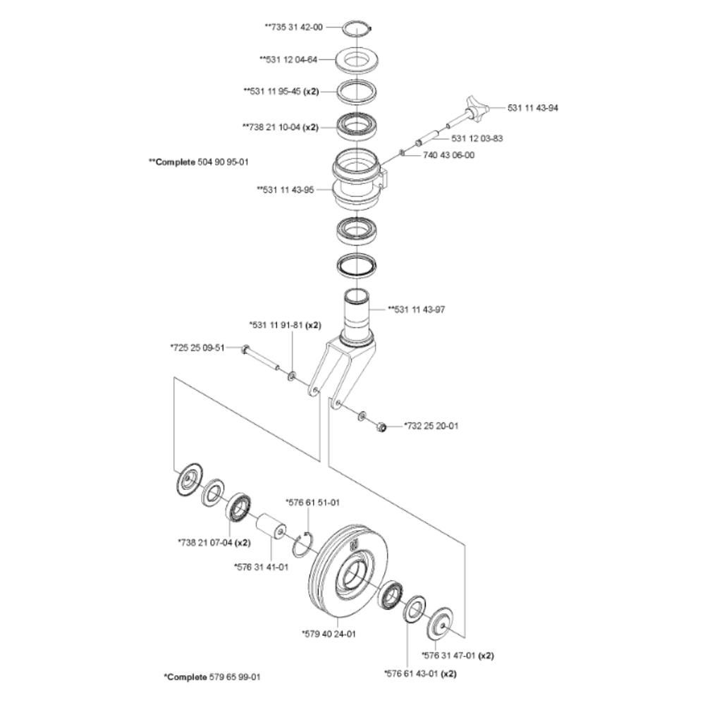The Swivel Pulley Assembly for the Husqvarna CS 2512 Wire Saw is designed to ensure smooth operation and efficient cutting performance. This assembly includes components such as pulleys and bearings that facilitate the movement of the wire saw, reducing friction and wear. Essential for maintaining the saw's functionality, it helps in precise cutting tasks.