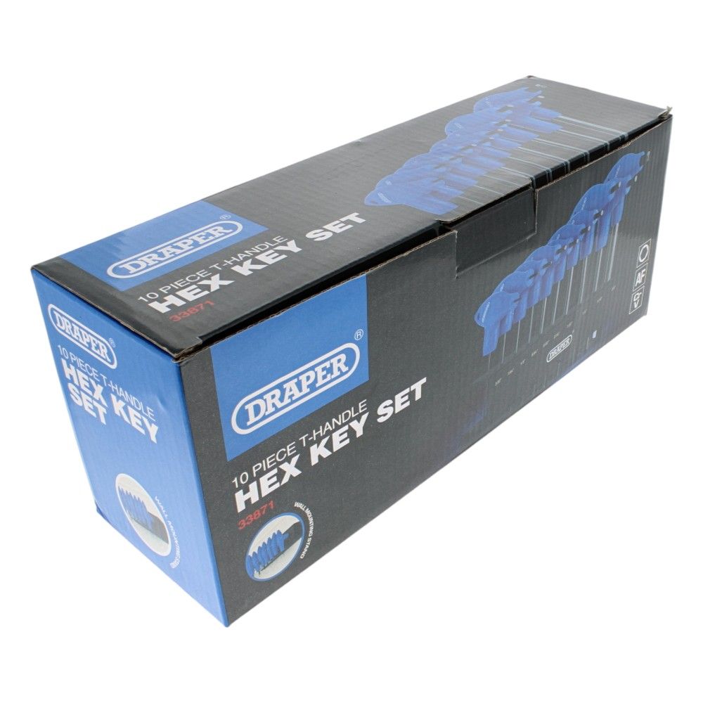 The Draper T Handle Hexagon Key Set of 10 Imperial (3/32-3/8in) is a genuine tool set for tightening and loosening imperial hex fasteners on machinery, vehicles, and equipment. Each key combines a robust steel shaft with a 6-inch (15.24 cm) cushioned T‐handle for firm grip and better leverage, helping reduce hand fatigue during longer tasks. The set spans 10 common imperial sizes from 3/32 inch (2.38 mm) up to 3/8 inch (9.53 mm), covering a wide range of fixings found in workshop, site, and garage work. Supplied with an organised storage rack, it keeps sizes easy to find and ready to use. A reliable choice for trades and DIY alike, this is a Genuine Draper product (MPN: 33871) built for day‐to‐day use.