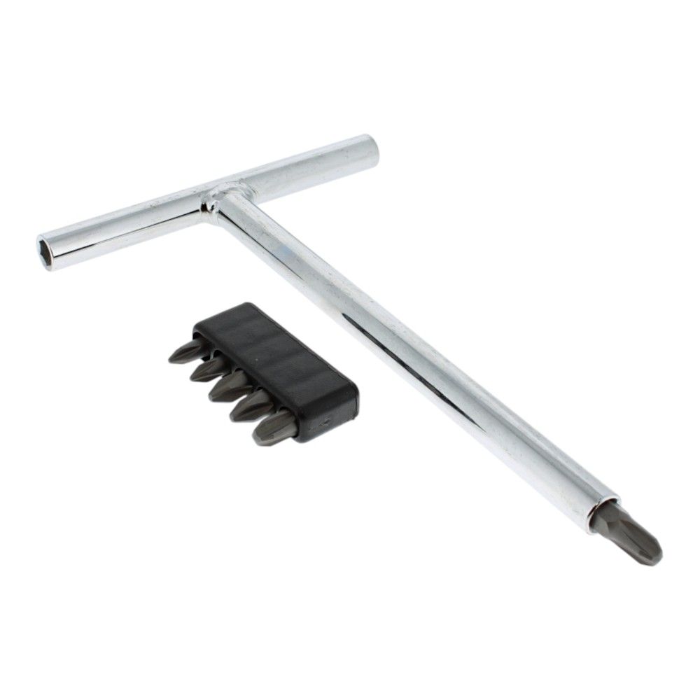 T-handle JIS screwdriver, complete with 6 x JIS screwdriver bits and a magnetic bit holder. Similar in look to a Phillips® screw, JIS screws are commonly found on Japanese equipment and are designed not to not allow the screwdriver to slip out of the screw head.