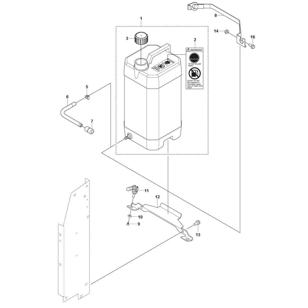 The Tank Assembly for the Husqvarna FS500 E Floor Saw includes essential components to ensure optimal performance and longevity. This assembly is crucial for maintaining the saw's efficiency by storing and supplying necessary fluids. Genuine Husqvarna parts ensure compatibility and reliability, supporting the saw's operation in demanding conditions.