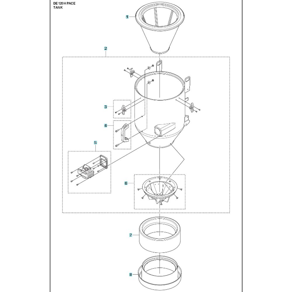 The Tank Assembly for the Husqvarna DE120H-PACE Dust Extractor is designed to ensure optimal dust collection and containment. This assembly includes essential components that maintain the efficiency and reliability of the dust extractor. It is crucial for keeping the workspace clean and safe by effectively managing dust and debris during operation.