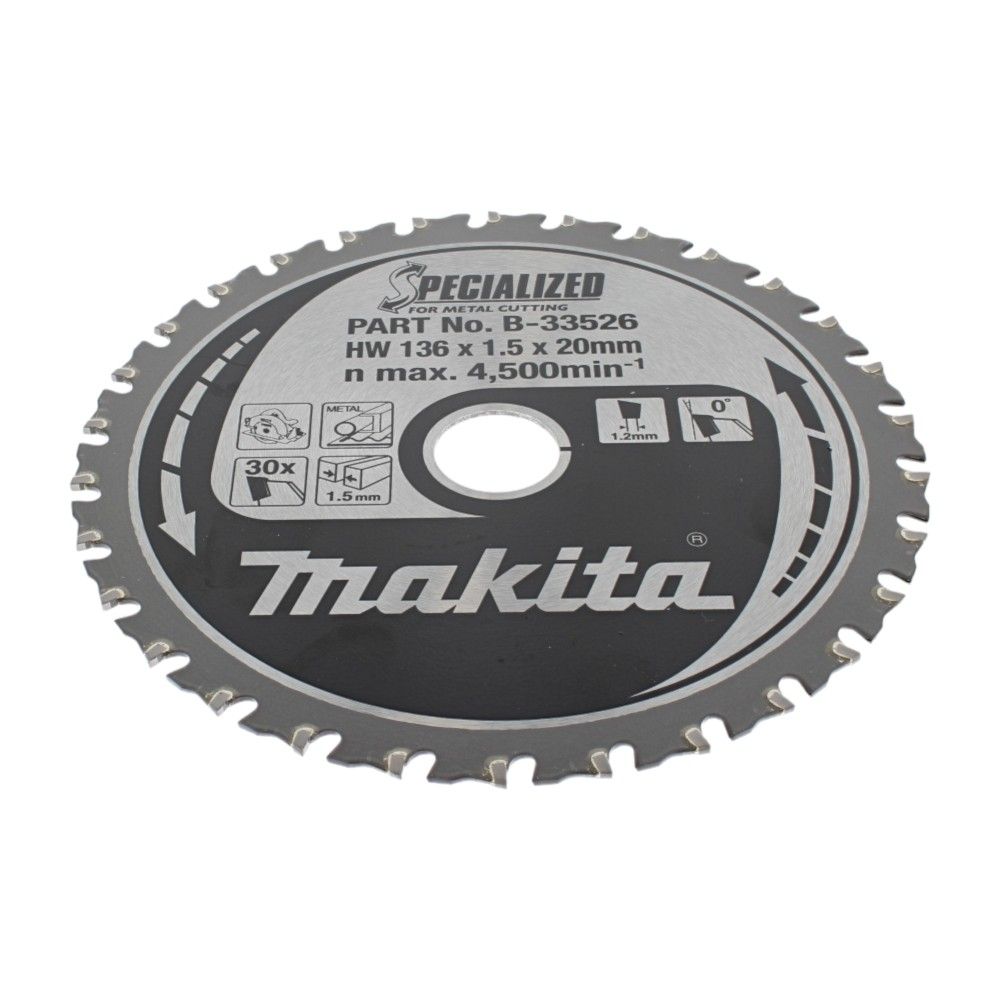 TCT metal-cutting circular saw blade, Makita metal blade 136 mm, 30T metal saw blade, 20 mm bore circular saw blade for metal, Makita Specialized for Metal blade, Makita B-33526 circular saw blade, metal cutting TCT blade.