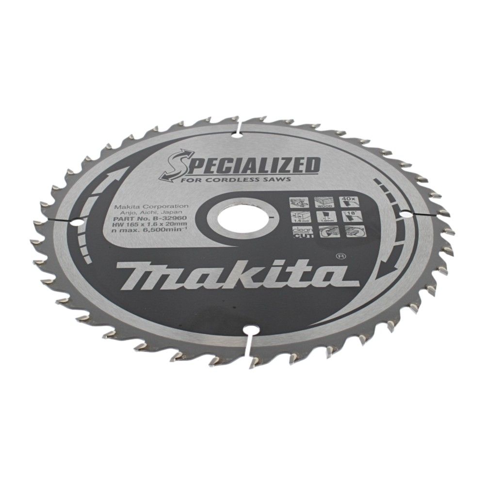 The Makita 165mm x 20mm Circular Saw Blade is a genuine, high-precision TCT (Tungsten Carbide Tipped) blade for clean, accurate cutting. With a 165 mm diameter (6.5 inches) and a 20 mm bore (approx. 0.79 inches), it fits many hand-held circular saws that require this size. The 40-tooth configuration, 1.6 mm thin kerf, and 18° rake angle support smooth feeding and neat finishes in timber and wood-based sheet materials. Built on a hardened steel plate for stability and durability, it is suitable for site and workshop use. Genuine Makita OEM part B-32960, it supersedes B-09248, providing a reliable like-for-like replacement for users maintaining Makita equipment.
