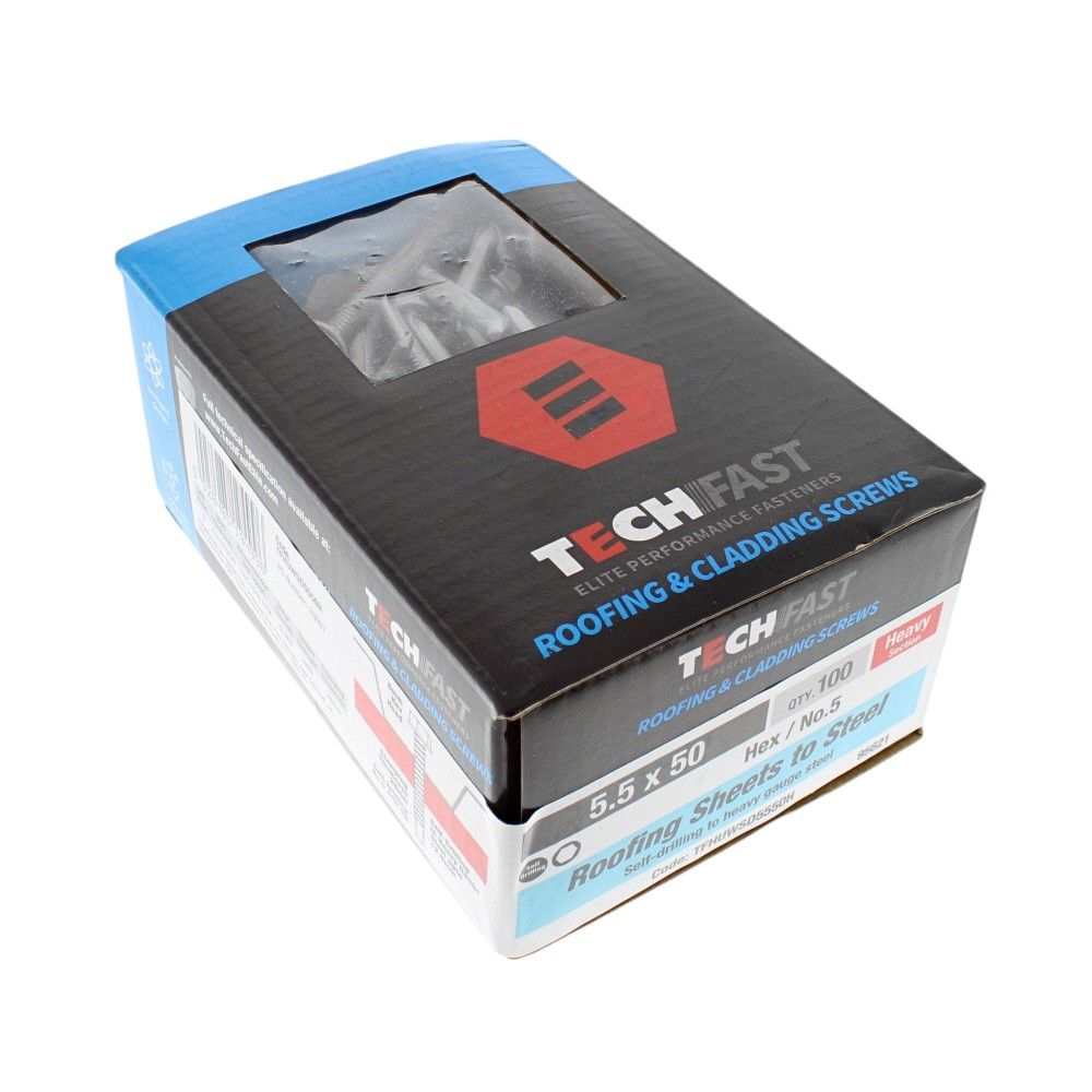 The TechFast Roofing Sheet to Steel Hex Screw No.5 Tip 5.5 x 50mm is a high-quality fixing solution designed for securing metal roofing panels to steel frame structures. Manufactured by ForgeFix, these screws are crafted from durable materials and feature a No.5 drill tip, allowing for efficient self-drilling in heavy gauge steel up to 12.5mm. With a robust 8mm hex head, these screws provide reliable fastening and are ideal for both professional tradespeople and DIY enthusiasts working on construction and garden machinery projects. The corrosion-resistant Elementech coating ensures longevity, making them suitable for various environmental conditions.