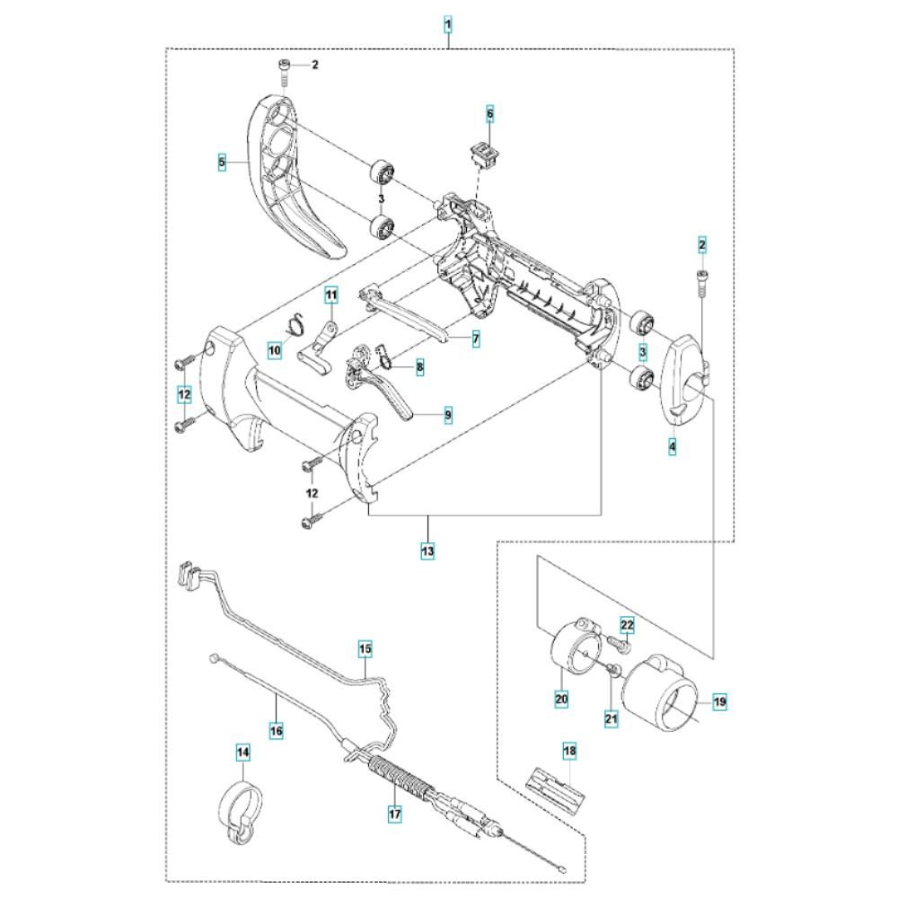 The Throttle Assembly for the Husqvarna 543RB Brushcutter is designed to ensure precise control and efficient operation. This assembly includes components such as cables, levers, and springs, which are essential for maintaining the brushcutter's performance. Genuine Husqvarna parts provide reliability and durability, making them ideal for routine maintenance and repairs.