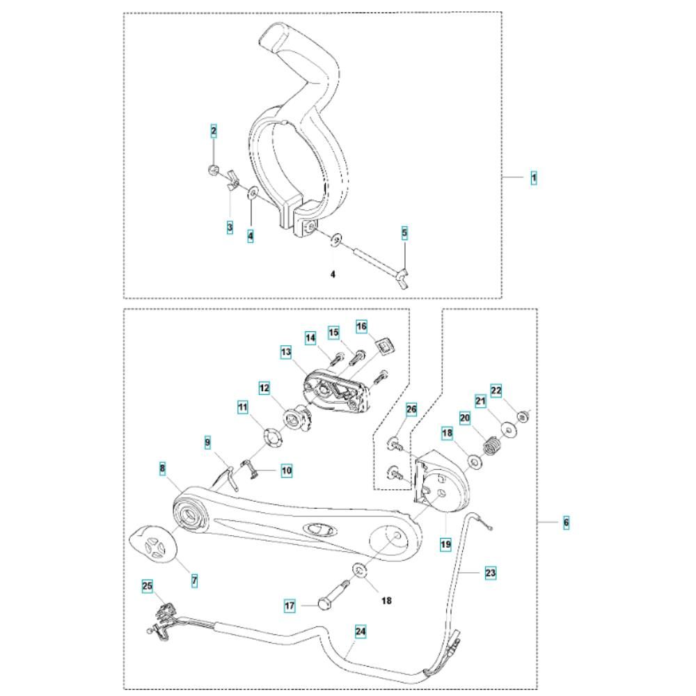 The Throttle Control Assembly for the Husqvarna 580BFS Mark II Blower ensures precise speed regulation and optimal performance. This assembly includes components such as cables, levers, and springs, designed to maintain the blower's efficiency and reliability. Essential for routine maintenance, it helps in achieving smooth operation and extended service life.