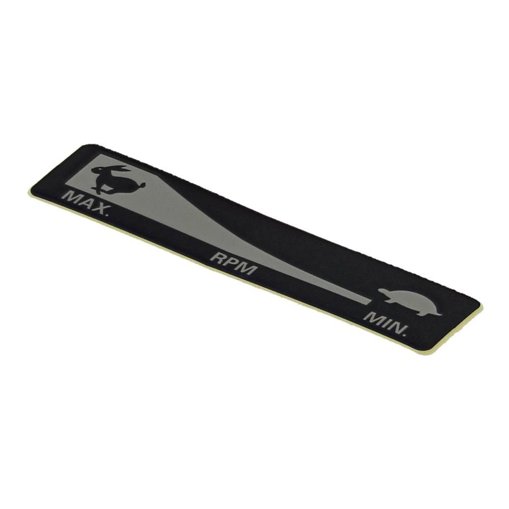 Throttle label, throttle mark sticker, control panel decal, engine speed label, RPM scale sticker, governor lever label, throttle position indicator.