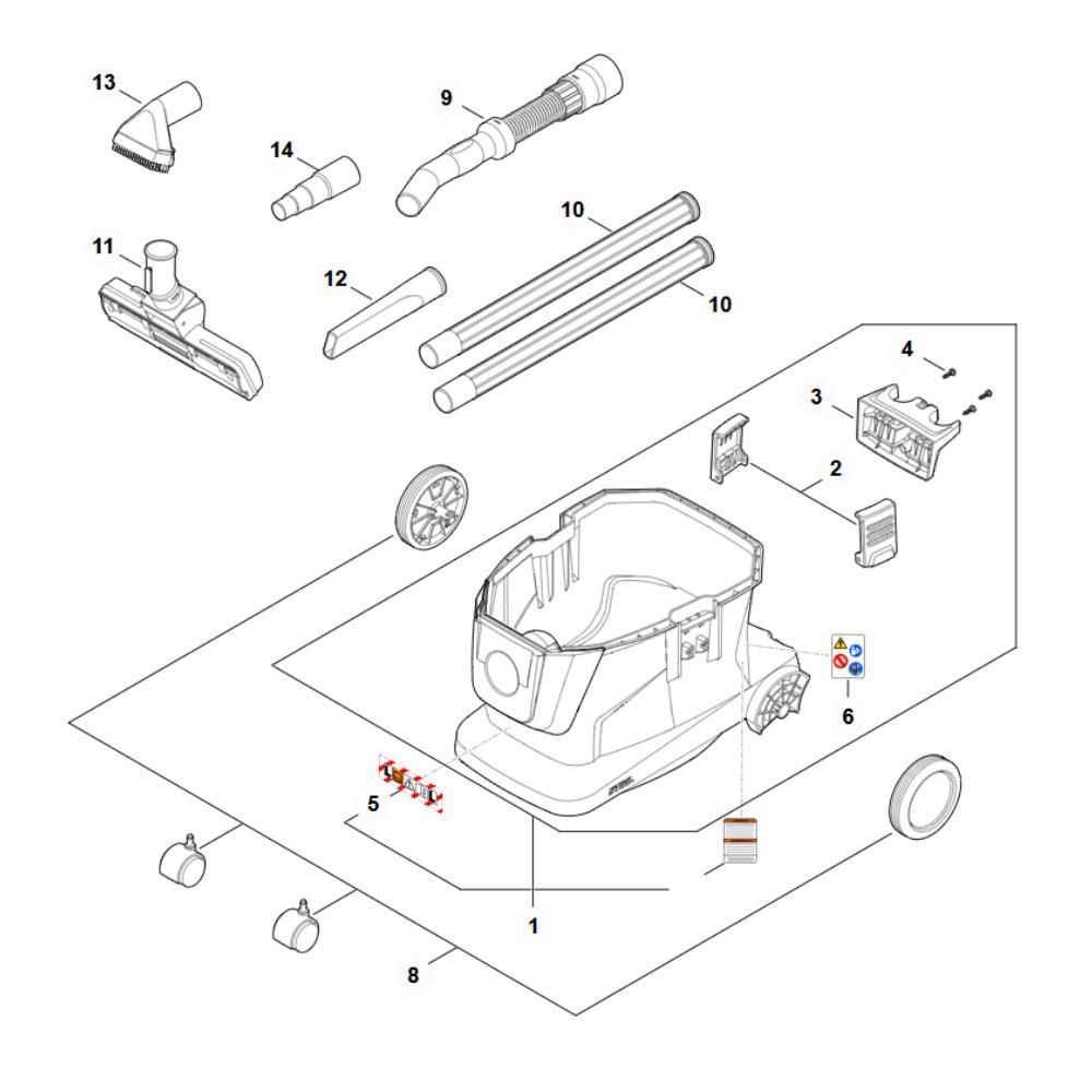 The Tools Assembly for Stihl SEA100 and SEA100L Vacuum Cleaners includes essential components to ensure optimal performance. This genuine Stihl part is designed to enhance the functionality of your vacuum cleaner, providing reliable operation and efficient cleaning. Components may include hoses, nozzles, and connectors, tailored for specific cleaning tasks.