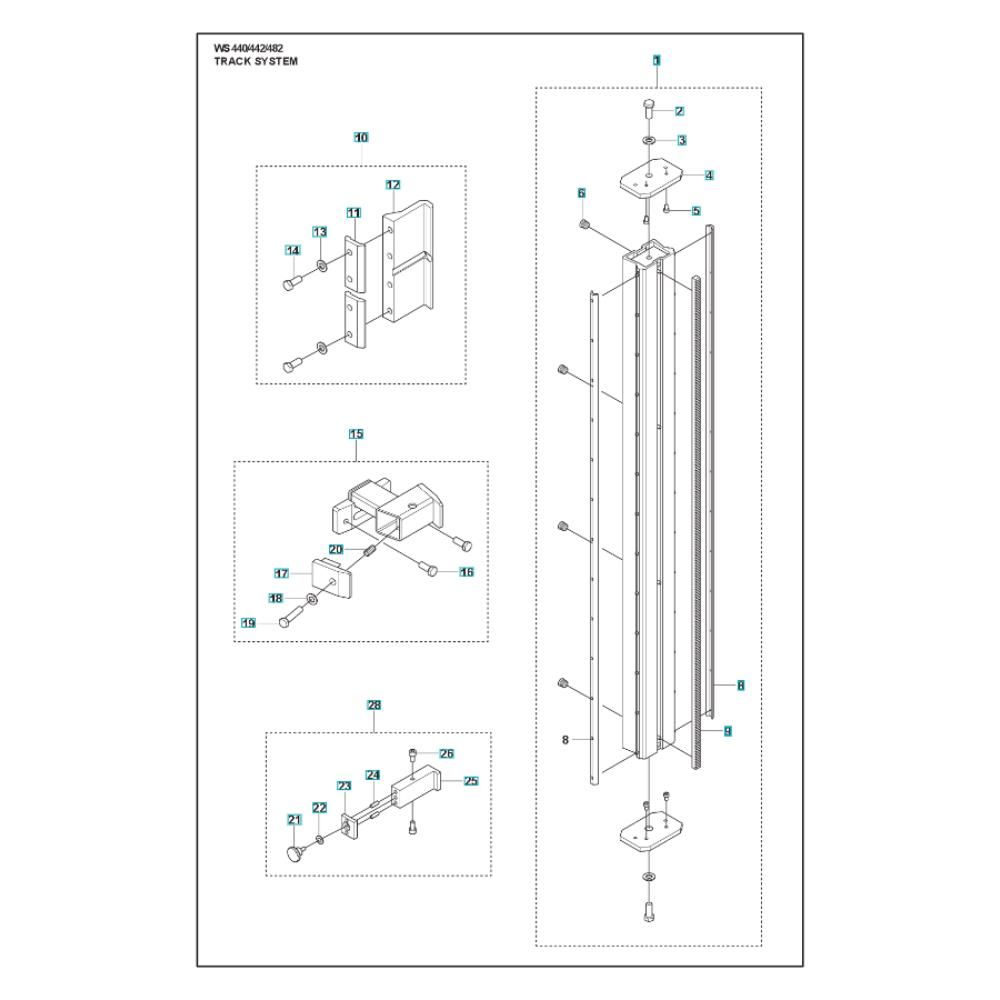 The Track Assembly for the Husqvarna WS 442 HF Wall Saw is essential for precise cutting operations. This assembly ensures smooth and accurate movement of the saw, enhancing cutting efficiency and precision. Components typically include rails, connectors, and mounting brackets, all designed to maintain stability and performance during use.