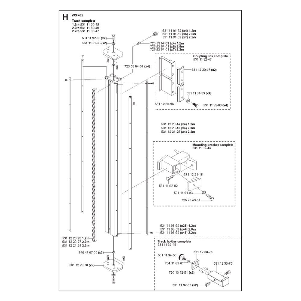 The Track Assembly for the Husqvarna WS 462 Wall Saw is designed to ensure precise cutting and optimal performance. This assembly includes key components such as rails, connectors, and fasteners, which are essential for maintaining the stability and accuracy of the wall saw. Suitable for both routine maintenance and repairs, it helps in achieving clean and efficient cuts.