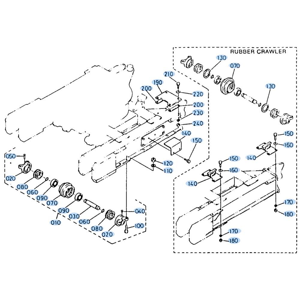 The Track Roller Assembly for the Kubota KH35 Mini Excavator is designed to ensure smooth and efficient operation of the undercarriage. This assembly includes components such as rollers, seals, and bearings, which work together to support the weight of the excavator and facilitate movement over various terrains. Genuine Kubota parts ensure compatibility and reliability for maintenance and repairs.
