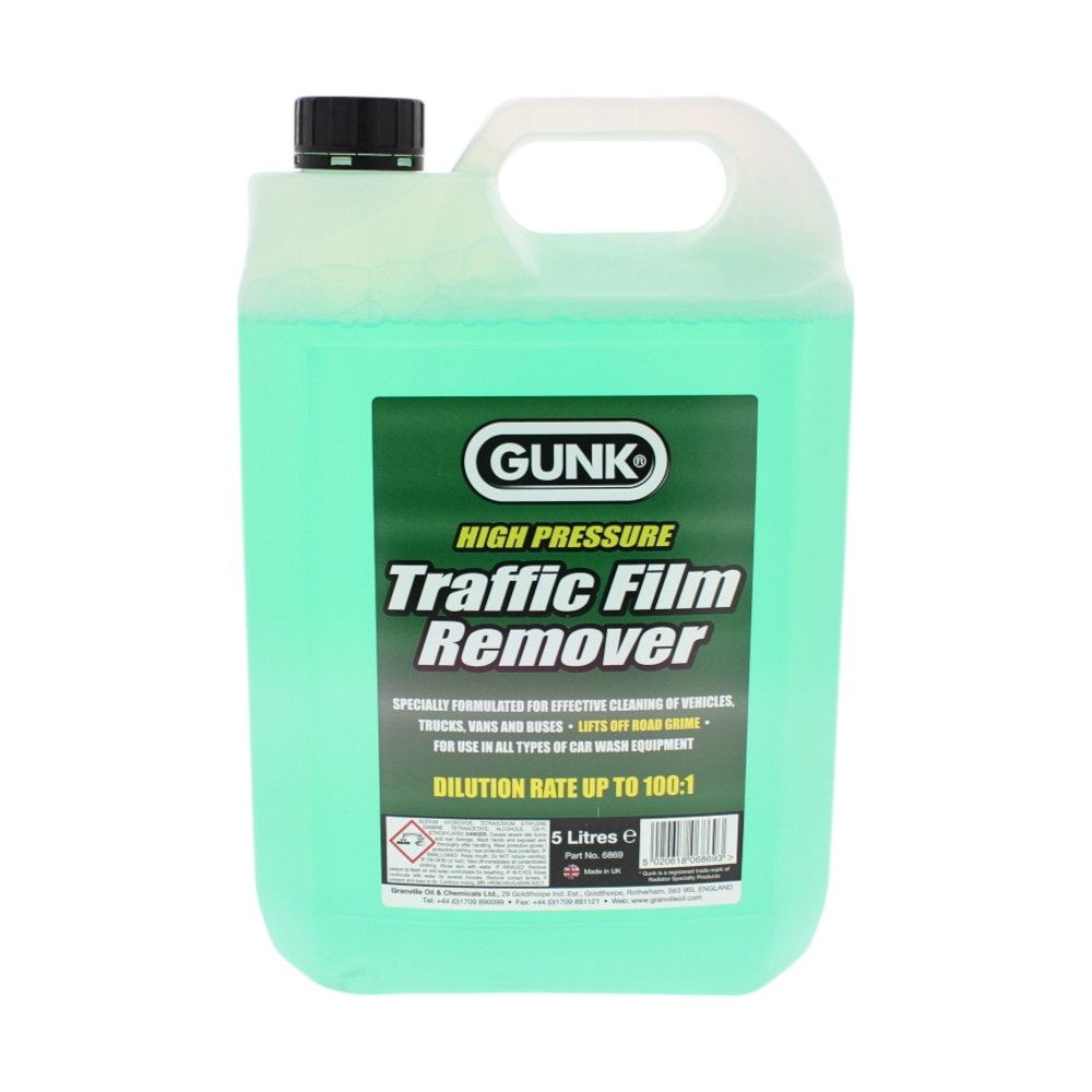 GUNK Traffic Film Remover Concentrate is a liquid cleaning solution formulated for use with pressure washers to cut through stubborn road film, oil, and general grime. Supplied in a 5 litre bottle (approx. 1.10 imperial gallons), it is suitable for hot or cold machines and delivers a streak-free finish on painted vehicle surfaces when used correctly. The concentrate is designed for regular cleaning of cars, vans, and light commercial vehicles, and is also effective on chassis areas and oily deposits in engine bays. Its concentrated format helps reduce product use per clean, making it practical for workshops, valeters, and fleet users. For easy identification and reordering, the Manufacturer Part Number is 310 063.