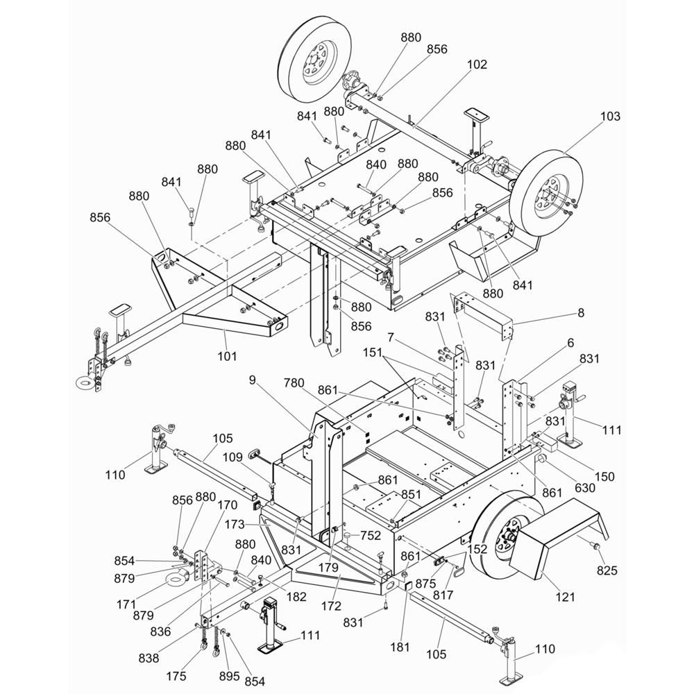 The Trailer Assembly for the Wacker LTW20Z1 Lighting Tower includes key components to ensure stability and mobility. Designed for the Wacker Neuson Light Tower, this assembly supports the tower's transport and positioning. Typical parts include axles, wheels, and hitches, all contributing to reliable performance in various conditions.