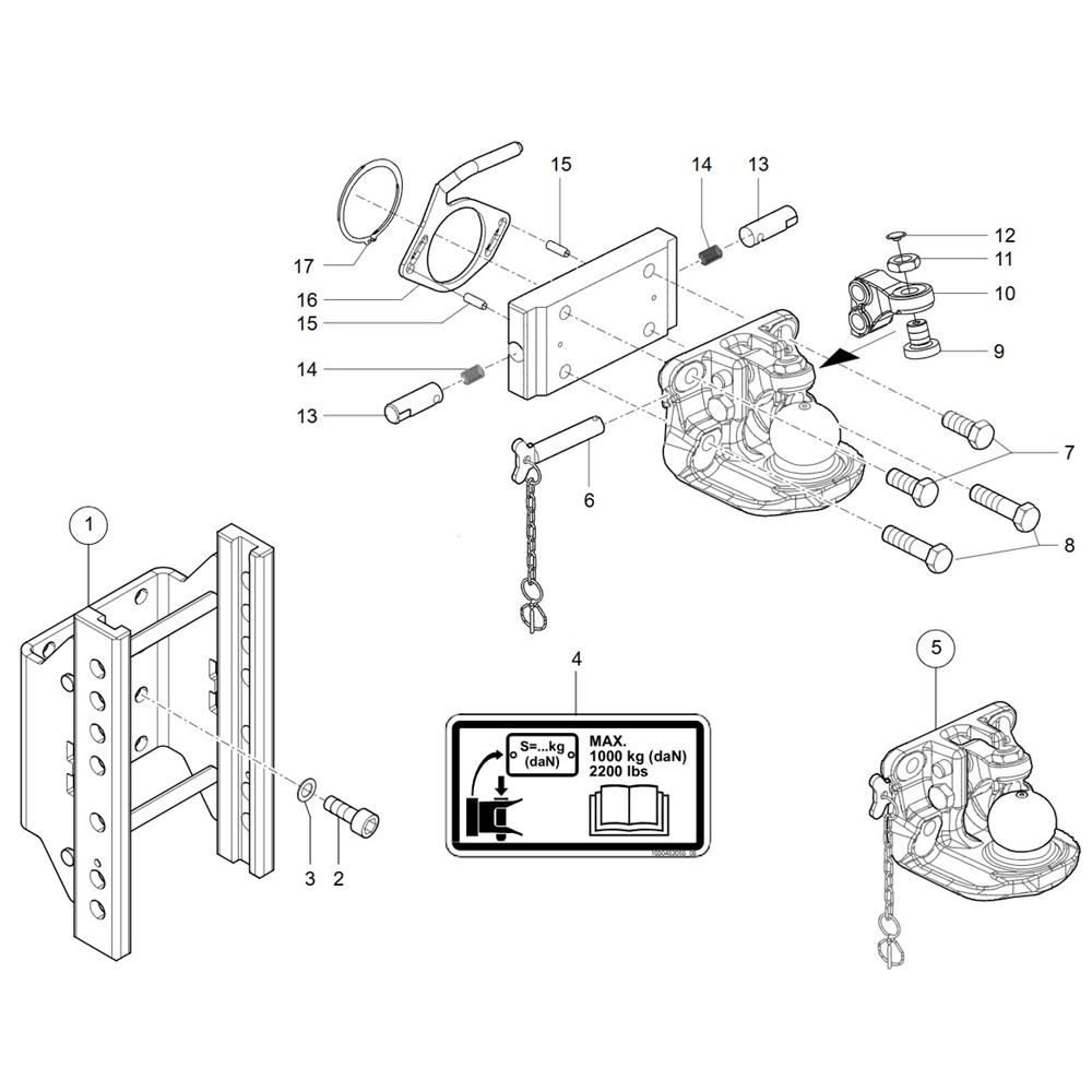 The Trailer Hitch Assembly for the Wacker TH730 (415-14) Telehandler is designed to facilitate secure towing and transport tasks. This assembly includes components essential for reliable hitch operation, ensuring compatibility with the Wacker Neuson Telehandler. It supports efficient attachment and detachment, enhancing the machine's versatility in various work environments.