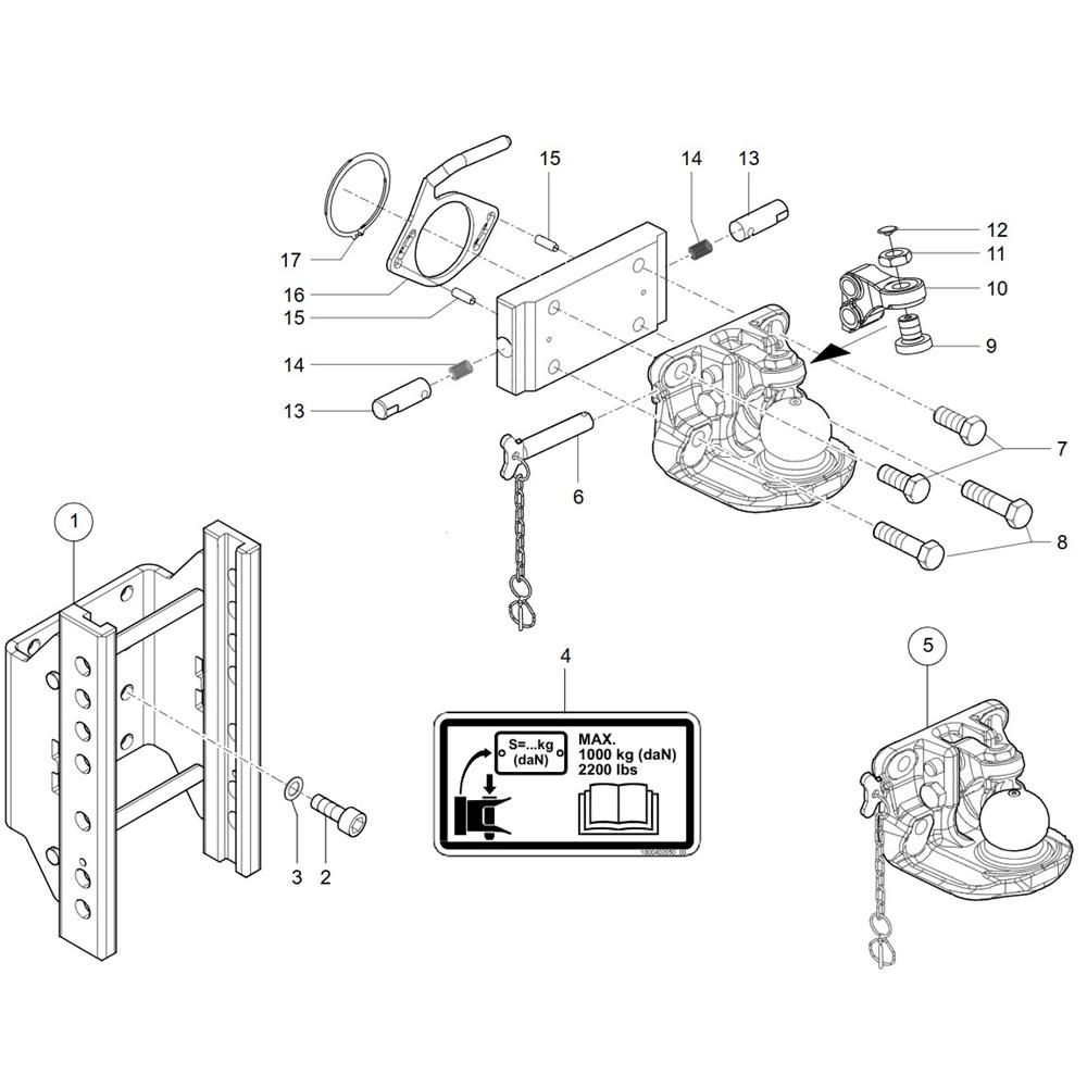 The Trailer Hitch Assembly for the Wacker TH740 (415-27) Telehandler is designed to facilitate secure towing and transport tasks. This assembly includes components such as the hitch receiver, locking pins, and mounting brackets, ensuring compatibility and reliability. Genuine Wacker Neuson parts guarantee optimal performance and durability for demanding work environments.