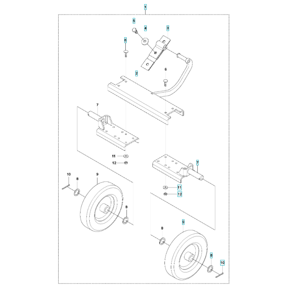 The Transport Assembly for the Husqvarna LG 300 Petrol Reversible Compactor is designed to facilitate easy movement and positioning of the machine. This assembly includes components such as wheels, axles, and brackets, ensuring stability and ease of use. Essential for maintaining the efficiency and functionality of the compactor, it supports smooth operation on various surfaces.