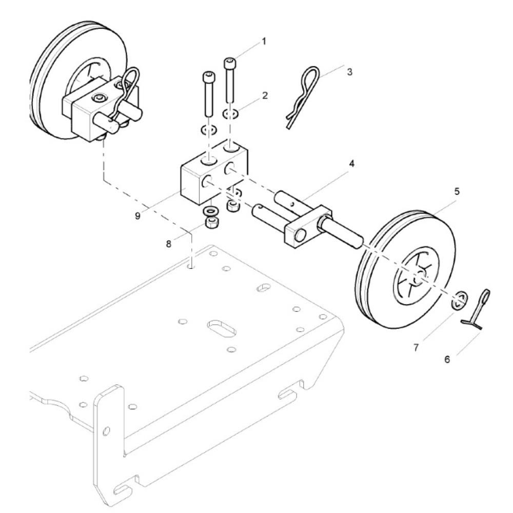 The Transport Wheels Assembly for Bomag BPS1845 Plate Compactors is designed to facilitate easy movement and positioning of the machine. This assembly includes durable wheels and mounting components, ensuring efficient transport across various surfaces. Essential for maintaining the mobility and functionality of your compactor, it is a genuine Bomag spare part.