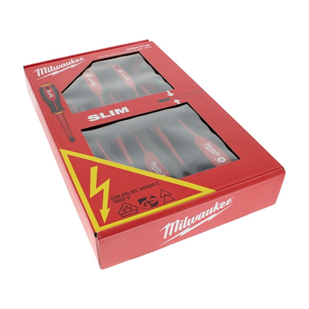 The Tri-Lobe VdeSlim Screwdriver PZ Set (7 Pieces) is a genuine Milwaukee insulated Pozidriv screwdriver kit designed for safe, precise electrical work and general maintenance. Each driver features a slim, VDE-style insulated shaft to reach recessed terminals and tight spaces without compromising access, paired with a durable steel blade for consistent performance. The red/yellow insulated handle provides clear visibility in tool bags and on site, while the ergonomic tri-lobe shape gives a secure, comfortable grip for controlled torque. Suitable for tradespeople and DIY users, these screwdrivers are ideal for work on switchgear, junction boxes, consumer units, and control panels found across construction, plant, and garden machinery electrics. OEM No. 4932478738 confirms you are getting the correct genuine Milwaukee part.