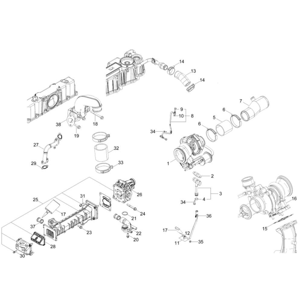 The Turbo Supercharger Assembly for the Wacker DV60 Dumper enhances engine performance by increasing air intake efficiency. This assembly includes components such as turbines, compressors, and housings, ensuring optimal power output and fuel efficiency. Genuine Wacker Neuson parts guarantee compatibility and reliability for your dumper.