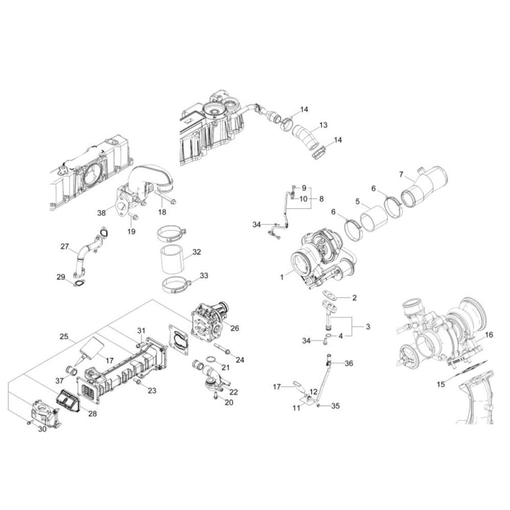 The Turbo Supercharger Assembly for the Wacker DV90 Dumper is designed to enhance engine performance by increasing air intake efficiency. This assembly includes key components such as the turbine, compressor, and housing, ensuring optimal power output and fuel efficiency. Genuine Wacker Neuson parts guarantee compatibility and reliability for your dumper.