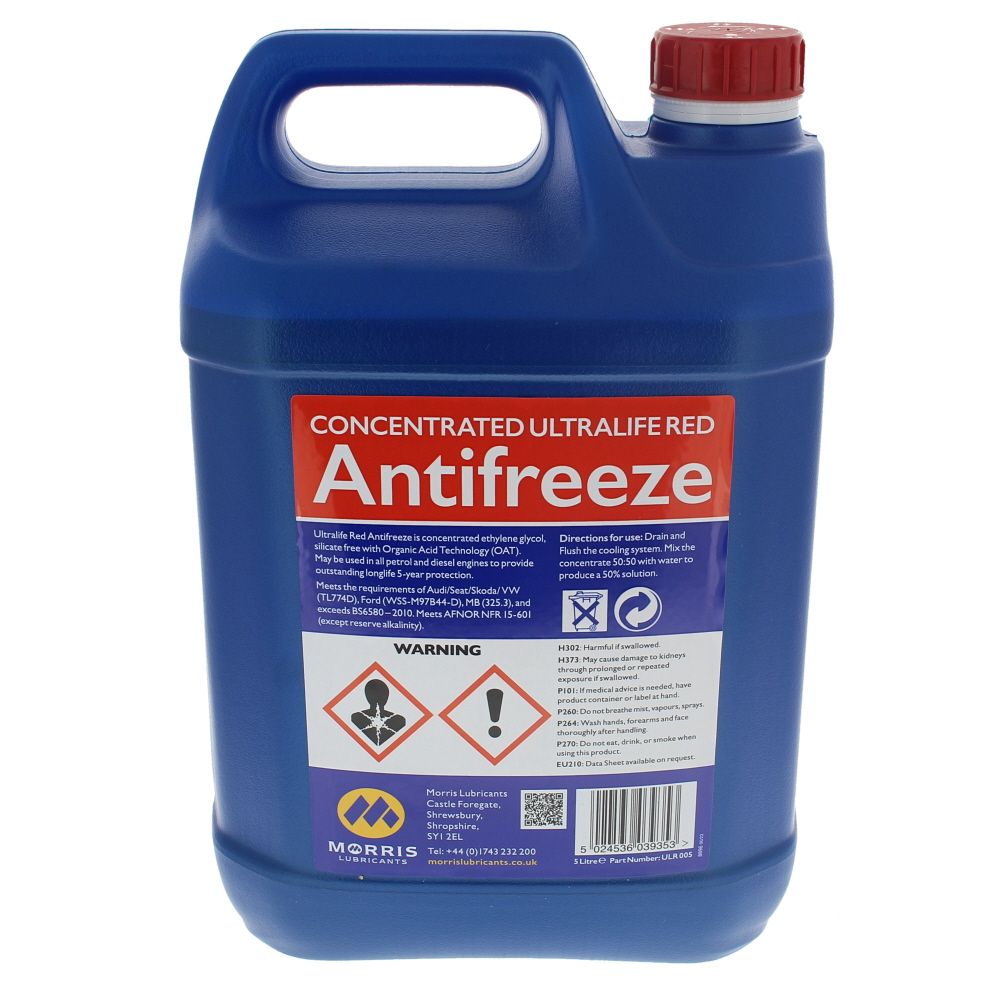 Morris Lubricants Ultra Life Red Ethylene Glycol based Antifreeze is a long-lasting engine coolant concentrate using organic acid technology (OAT). Formulated without nitrites, amines, phosphates, borates, or silicates, it provides reliable protection against frost, corrosion, and scale in modern mixed-metal cooling systems. When mixed at 50% of the total coolant volume with clean water, it protects down to -40°C, making it suitable for year-round use in UK conditions. Supplied in a 5 litre container, it is ideal for petrol and diesel engines found in construction plant, generators, compact tractors, ride-on mowers, and other garden machinery. The red colour aids identification during maintenance and helps avoid cross-mixing with other coolant types. Designed to maintain cooling efficiency and component life under varied loads and environments.