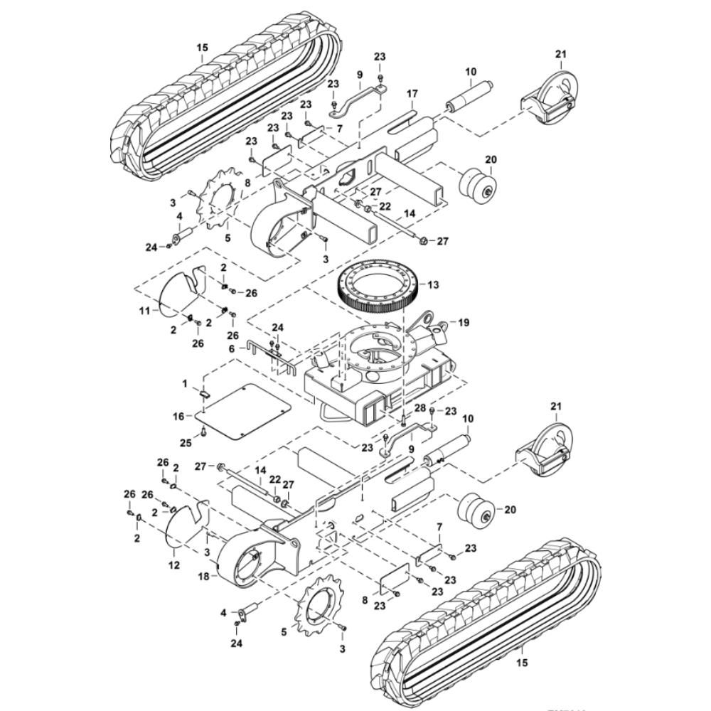 The Undercarriage Assembly for BobCat E10 Mini Excavators, covering serial numbers A33P11001 to A33P17234, includes essential components for maintaining stability and mobility. This assembly features parts such as tracks, rollers, and idlers, ensuring optimal performance and durability. Suitable for both genuine and non-genuine parts, it supports efficient excavation tasks.