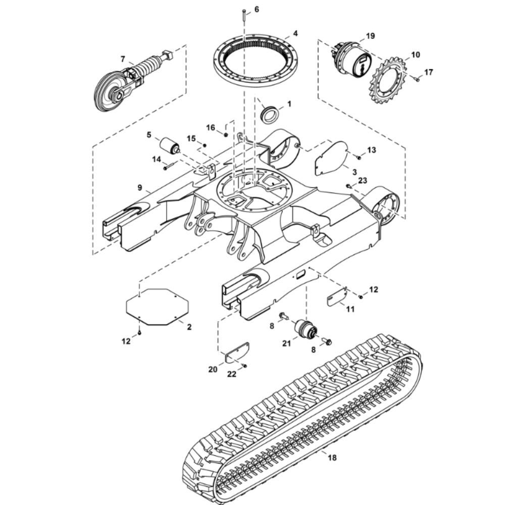 The Undercarriage Assembly for BobCat E26 Mini Excavators (S/N AJRY11001 & Above) includes essential components to ensure optimal performance and longevity. Designed for both genuine and non-genuine parts, this assembly supports the machine's stability and mobility. Key components may include tracks, rollers, idlers, and sprockets, all crucial for maintaining efficient operation in various terrains.