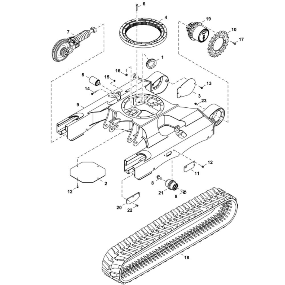 The Undercarriage Assembly for BobCat E26 Mini Excavators (S/N B33211001 & Above) includes essential components to ensure optimal performance and durability. This assembly helps maintain stability and mobility on various terrains. Available parts may include tracks, rollers, idlers, and sprockets, catering to both genuine and non-genuine options.