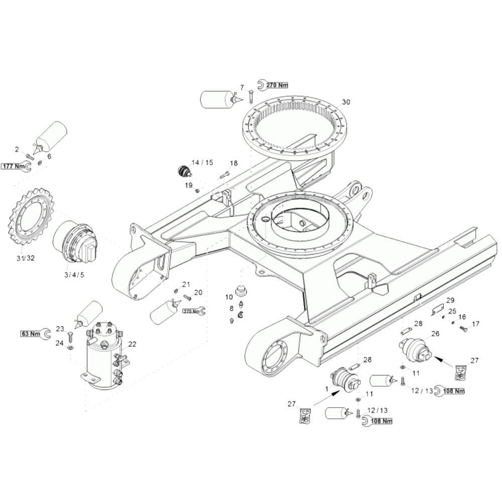 The Undercarriage Assembly for the Neuson 75Z3 Mini Excavator includes essential components designed to support the machine's stability and mobility. This assembly features genuine Wacker Neuson parts, ensuring compatibility and reliability. Key components may include tracks, rollers, idlers, and sprockets, all crucial for optimal performance and durability in various excavation tasks.