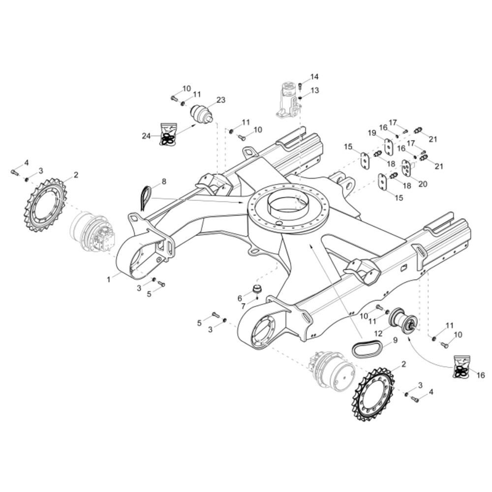 The Undercarriage Assembly for the Wacker ET42 Mini Excavator includes essential components to ensure stability and mobility. Designed for optimal performance, it features tracks, rollers, idlers, and sprockets that work together to support the machine's weight and movement. Genuine Wacker Neuson parts ensure durability and compatibility, making it ideal for construction and landscaping tasks.